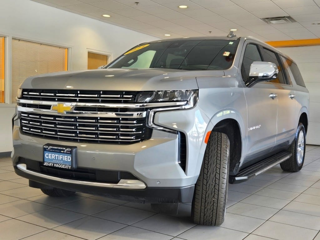 Suburban Premier, 4D Sport Utility, EcoTec3 5.3L V8, 10-Speed Automatic with Overdrive, 4WD, Sterling Gray Metallic, Black Leather, 10 Speakers, 12-Way Power Driver & Passenger Seat Adjusters, 15 Diagonal Multi-Color Head-Up Display, 1st & 2nd Row Color-Keyed Carpeted Floor Mats, 1st, 2nd & 3rd Row All-Weather Floor Liners (LPO), 2-Speed Active Electronic AutoTrac Transfer Case, 20 x 9 Polished Aluminum Wheels, 3.23 Rear Axle Ratio, 3rd Row 60/40 Power-Folding Split-Bench, 3rd row seats: split-bench, 4-Wheel Disc Brakes, ABS brakes, Adaptive Cruise Control, Adaptive suspension, Advanced Trailering Package, Air Conditioning, Alloy wheels, AM/FM radio: SiriusXM with 360L, Apple CarPlay/Android Auto, Auto High-beam Headlights, Auto-dimming door mirrors, Auto-Dimming Inside Rear-View Mirror, Auto-dimming Rear-View mirror, Auto-leveling suspension, Automatic temperature control, Bose 10-Speaker Surround w/CenterPoint, Brake assist, Bright Front & Rear Door Sill Plates, Bumpers: body-color, Chrome Door Handles w/Body-Color Strip, Chrome Mirror Caps, Color-Keyed Carpeting Floor Covering, Compass, Delay-off headlights, Driver & Front Outboard Passenger Airbags, Driver door bin, Driver vanity mirror, Dual Exhaust System, Dual front impact airbags, Dual front side impact airbags, Dual-Pane Power Panoramic Sunroof, Electronic Stability Control, Emergency communication system: OnStar and Chevrolet connected services capable, Enhanced Automatic Emergency Braking, Enhanced Display & Alert Package, Enhanced Driver Information Center, Extra Capacity Cooling System, Floor Console, Four wheel independent suspension, Front anti-roll bar, Front Bucket Seats, Front Center Armrest, Front dual zone A/C, Front reading lights, Fully automatic headlights, Garage door transmitter, Hands-Free Rear Power Programmable Liftgate, HD Surround Vision, Heated 2nd Row Outboard Seats, Heated door mirrors, Heated Driver & Front Passenger Seats, Heated front seats, Heated rear seats, Heated Steering Wheel, Heated steering wheel, Hill Descent Control, Hitch View w/Pan/Zoom Image Adjustment, Illuminated entry, Infotainment Display, Inside Rearview Auto-Dimming Rear Camera Mirror, Integrated Trailer Brake Controller, Lane Change Alert w/Side Blind Zone Alert, LED Daytime Running Lamps, Low tire pressure warning, Magnetic Ride Control Suspension, Max Trailering Package, Memory seat, Memory Settings, Occupant sensing airbag, Outside Heated Power-Adjustable Mirrors, Outside temperature display, Overhead airbag, Overhead console, Panic alarm, Passenger door bin, Passenger vanity mirror, Perforated Heated & Ventilated Seats, Perforated Leather Seating Surfaces, Power door mirrors, Power driver seat, Power Liftgate, Power passenger seat, Power Release 2nd Row Bucket Seats, Power steering, Power Tilt & Telescopic Steering Column, Power windows, Preferred Equipment Group 1LZ, Premium audio system: Chevrolet Infotainment 3 Premium, Premium Package, Radio: Chevrolet Infotainment 3 Premium System, Rain sensing wipers, Rear air conditioning, Rear anti-roll bar, Rear Camera Mirror Washer, Rear Cross Traffic Alert, Rear Pedestrian Alert, Rear reading lights, Rear window defroster, Rear window wiper, Remote keyless entry, Remote Start, Roof rack: xxxxxx, Safety Alert Seat, Security system, SiriusXM w/360L, Smart Trailer Integration Indicator, Speed control, Speed-sensing steering, Split folding rear seat, Spoiler, Steering wheel memory, Steering wheel mounted audio controls, Tachometer, Telescoping steering wheel, Tilt steering wheel, Traction control, Trailer Side Blind Zone Alert, Trip computer, Turn signal indicator mirrors, Universal Home Remote, Variably intermittent wipers, Ventilated front seats, Voltmeter, Wireless Charging, Wrapped Steering Wheel.