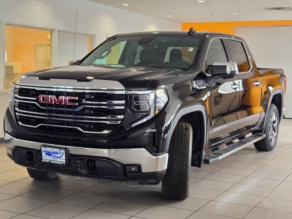 Sierra 1500 SLT, 4D Crew Cab, EcoTec3 5.3L V8, 10-Speed Automatic, 4WD, Onyx Black, Jet Black Leather, 10-Way Power Driver Seat Adjuster w/Lumbar, 10-Way Power Passenger Seat Adjuster w/Lumbar, 120-Volt Bed Mounted Power Outlet, 120-Volt Instrument Panel Power Outlet, 170 Amp Alternator, 2 Charge/Data USB Ports, 2 Charge/Data USB Ports Inside Center Console, 2 Type-C Charge-Only Rear USB Ports, 20 Polished Aluminum Wheels, 3.23 Rear Axle Ratio, 4-Wheel Disc Brakes, 6 Speakers, 6-Speaker Audio System Feature, ABS brakes, Air Conditioning, Alloy wheels, AM/FM radio: SiriusXM with 360L, Apple CarPlay/Android Auto, Auto High-beam Headlights, Auto-dimming door mirrors, Auto-dimming Rear-View mirror, Auto-Locking Rear Differential, Automatic Emergency Braking, Automatic temperature control, Auxiliary External Transmission Oil Cooler, Brake assist, Buckle to Drive, Bumpers: chrome, Chrome Header & Chrome Grille Insert Bars, Chrome Wheel To Wheel Assist Steps, Color-Keyed Carpeting Floor Covering, Compass, Deep-Tinted Glass, Delay-off headlights, Driver door bin, Driver Memory, Driver vanity mirror, Dual front impact airbags, Dual front side impact airbags, Electric Rear-Window Defogger, Electrical Steering Column Lock, Electronic Precision Shift, Electronic Stability Control, Emergency communication system: OnStar and GMC Connected Services capable, Exterior Parking Camera Rear, Floor-Mounted Center Console, Following Distance Indicator, Forward Collision Alert, Front 40/20/40 Split-Bench Seat, Front anti-roll bar, Front Bucket Seats, Front Center Armrest w/Storage, Front dual zone A/C, Front fog lights, Front Frame-Mounted Black Recovery Hooks, Front License Plate Kit, Front Pedestrian Braking, Front Rainsensing Wipers, Front reading lights, Front wheel independent suspension, Fully automatic headlights, GMC Connected Access Capable, HD Rear Vision Camera, Heated door mirrors, Heated Driver & Front Outboard Passenger Seating, Heated front seats, Heated Steering Wheel, Heated steering wheel, High Capacity Suspension Package, Hitch Guidance, Hitch Guidance w/Hitch View, Illuminated entry, In-Vehicle Trailering App, Integrated Trailer Brake Controller, IntelliBeam Automatic High Beam On/Off, Keyless Open & Start, Lane Keep Assist w/Lane Departure Warning, LED Cargo Area Lighting, Low tire pressure warning, Manual Tilt-Wheel & Telescoping Steering Column, Memory seat, Navigation System, Not Equip w/Heat & Vent Seat Cushion Blower Motor, Not Equipped w/Dynamic Fuel Management, Not Equipped w/Steering Column Lock, Occupant sensing airbag, OnStar & GMC Connected Services Capable, Outside temperature display, Overhead airbag, Overhead console, Panic alarm, Passenger door bin, Passenger vanity mirror, Perf Leather-Appointed Front Outboard Seat Trim, Perimeter Lighting, Power Door Locks, Power door mirrors, Power driver seat, Power Front Passenger Windows w/Express Up/Down, Power Front Windows w/Driver Express Up/Down, Power passenger seat, Power Rake & Telescoping Steering Column, Power Rear Windows w/Express Down, Power steering, Power windows, Preferred Equipment Group 4SA, Premium audio system: GMC Infotainment System, Premium Bose 7-Speaker Sound System, ProGrade Trailering System, Push Button Start, Radio data system, Radio: Premium GMC Infotainment Audio System, Rain sensing wipers, Rear reading lights, Rear seat center armrest, Rear step bumper, Rear Wheelhouse Liners, Rear window defroster, Remote keyless entry, Remote Vehicle Starter System, Security system, SiriusXM w/360L, SLT Convenience Package, SLT Premium Package, Speed control, Speed-sensing steering, Split folding rear seat, Standard Suspension Package, Steering Wheel Audio Controls, Steering wheel mounted audio controls, Tachometer, Telescoping steering wheel, Theft Deterrent System (Unauthorized Entry), Tilt steering wheel, Traction control, Trailering Package, Trip computer, Variably intermittent wipers, Ventilated Driver